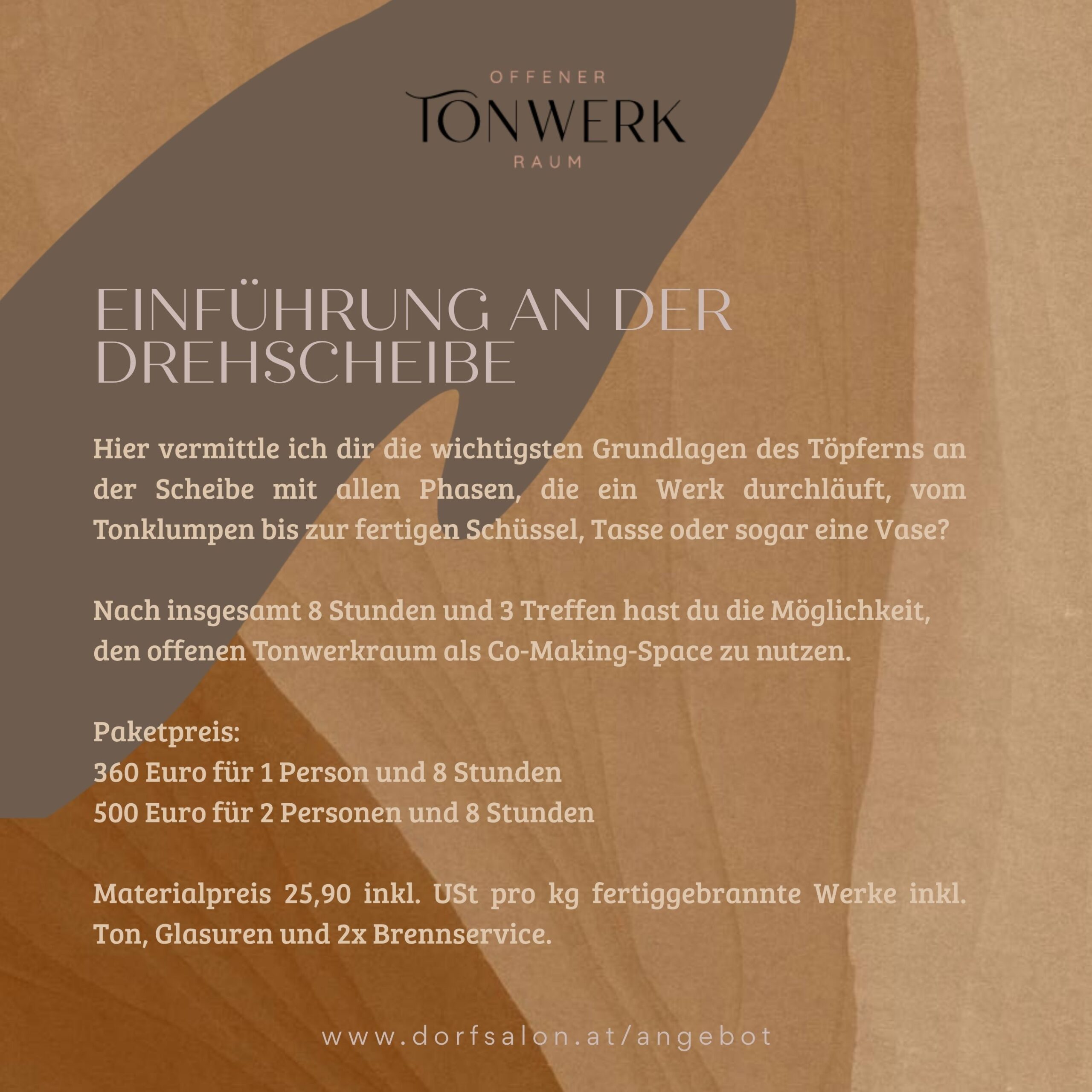 In den ersten 3 Stunden bringe ich dir Grundsätzliches näher, wir bereiten den Ton fürs Drehen vor und danach geht’s schon an die Drehscheibe. Wir erleben, wie durch unser Einwirken und unsere Ausrichtung der Ton reagiert, welche Phasen es beim Drehen gibt und wir widmen uns der Formgebung. Danach räumen und säubern wir gemeinsam den Arbeitsbereich.